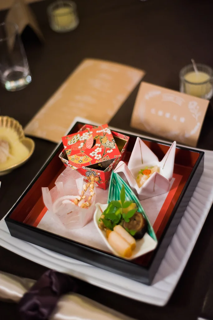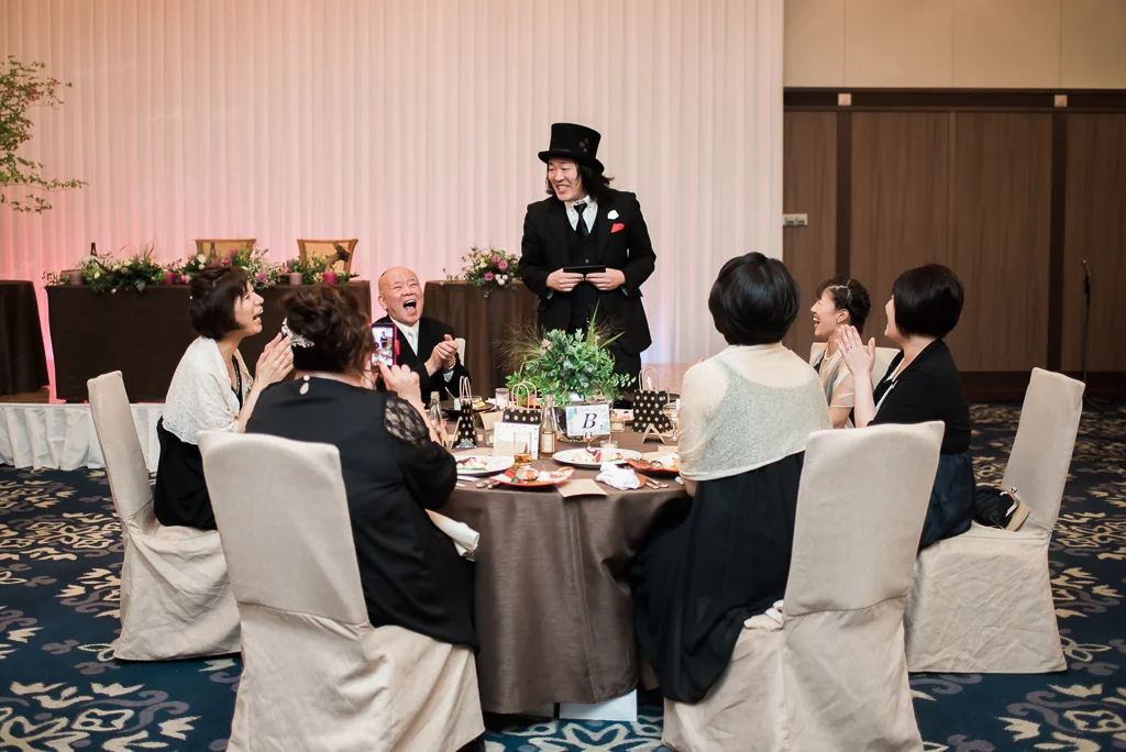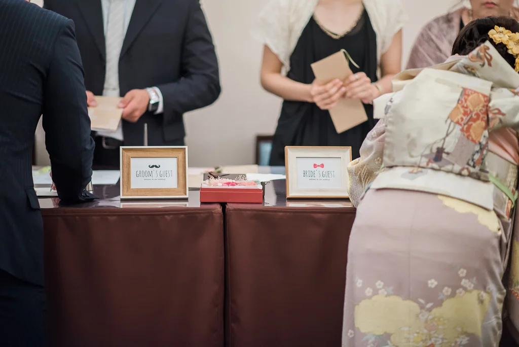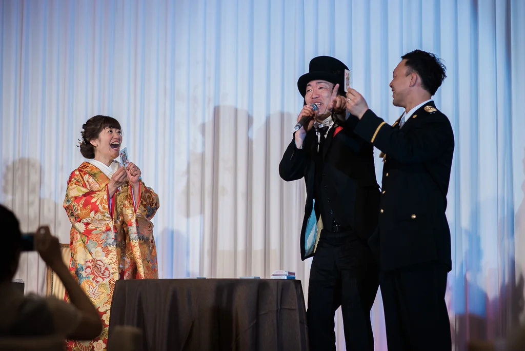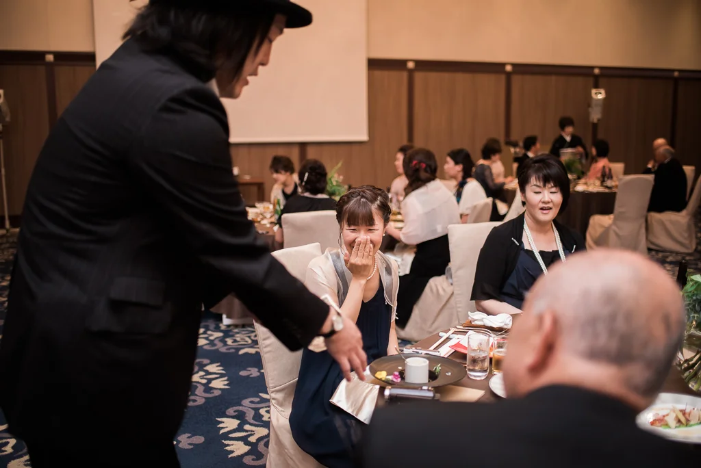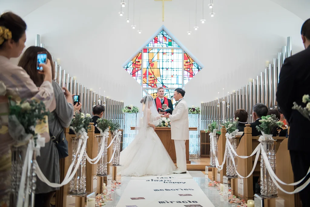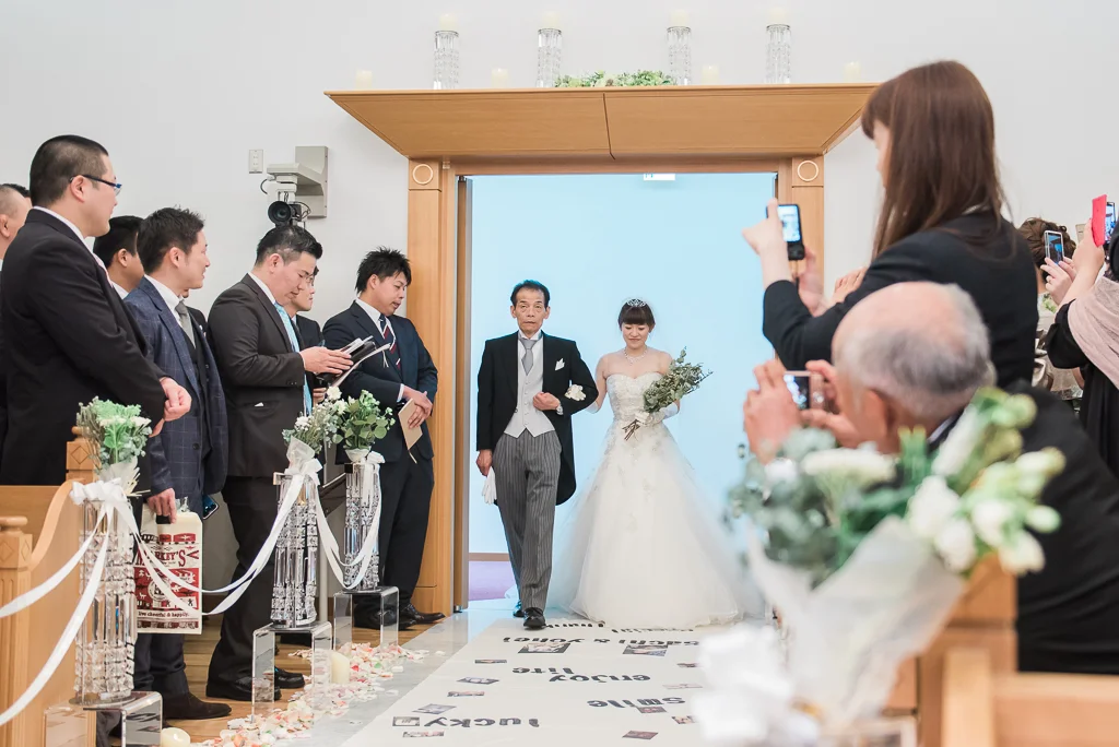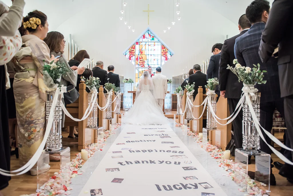 Sachiko & Youhei's wedding was held in a hotel and the couple added their personal touches to it. Sachiko spent weeks making a aisle runner as a surprise for Youhei. It had picture of Youhei's pictures from childhood to adult, days of their courtship. Such a beautiful idea to help relive memories as the couple walk down the aisle. The bridal room was bustling with laughter and chatter with Sachiko's stylists friends helping the couple prepare for their big day. There were glowing and moving speeches for the couple, magic shows for the guests, just lots of fun.