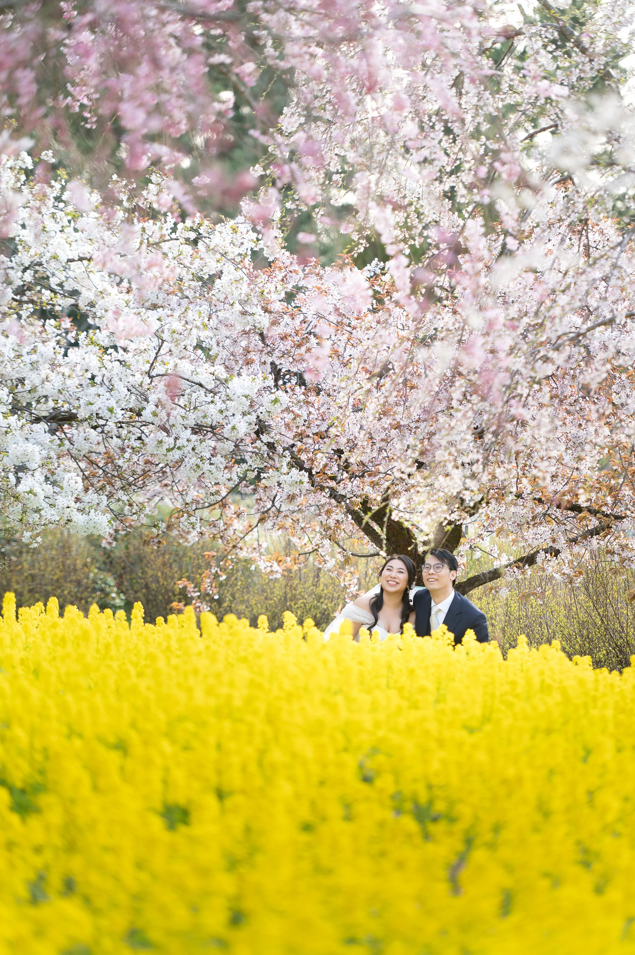 The Toyama Botanical Garden, a peaceful space surrounded by nature. Cherry blossom trees lined the paths, creating a soft pink backdrop that felt light and romantic without being overwhelming. The open spaces and natural light made it easy for the couple to relax and enjoy the moment. Walking under the blossoms, sharing quiet smiles, and simply being together felt natural here. The garden offered a clean, elegant setting that highlighted both the beauty of spring and the couple’s connection.