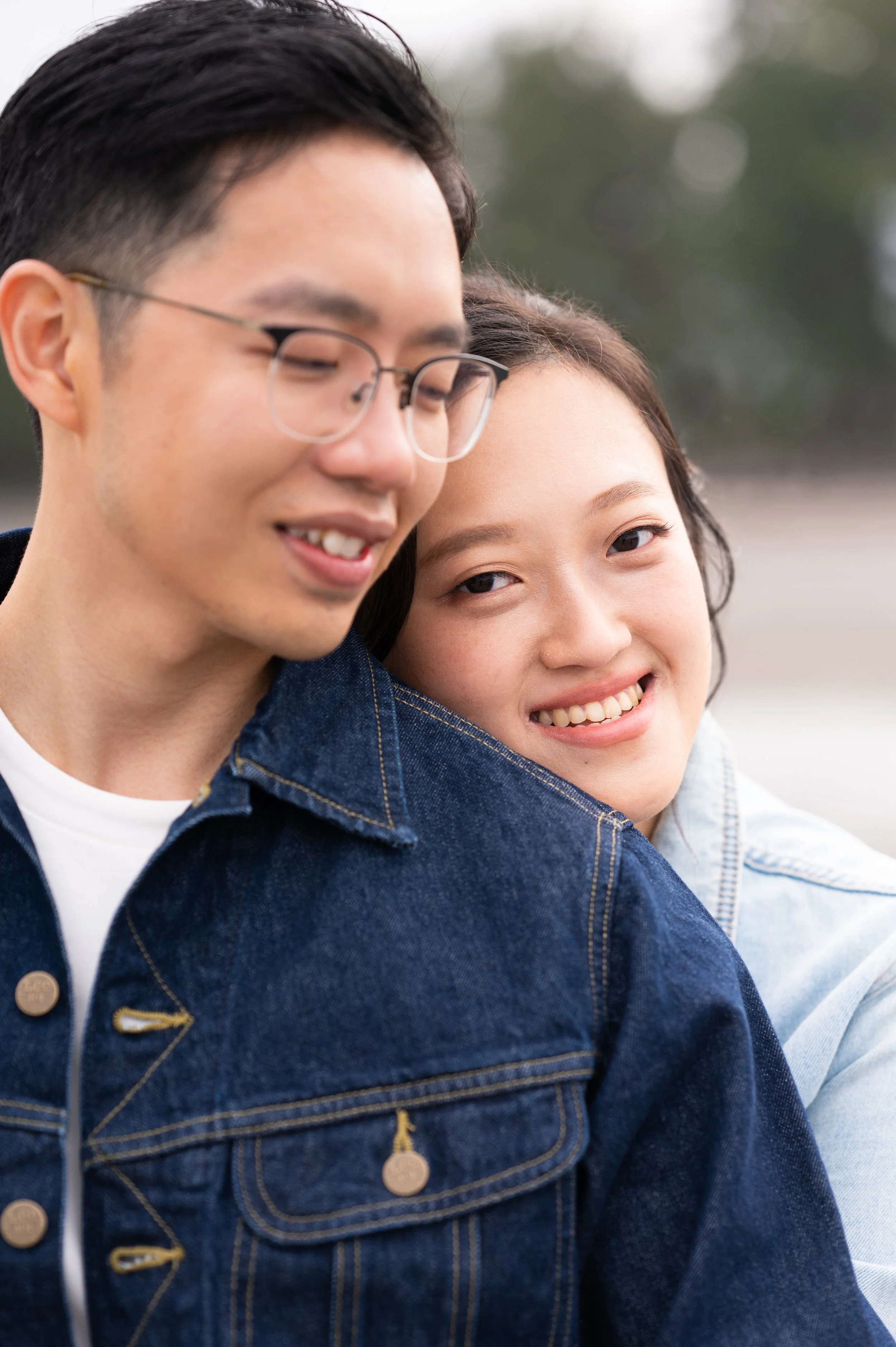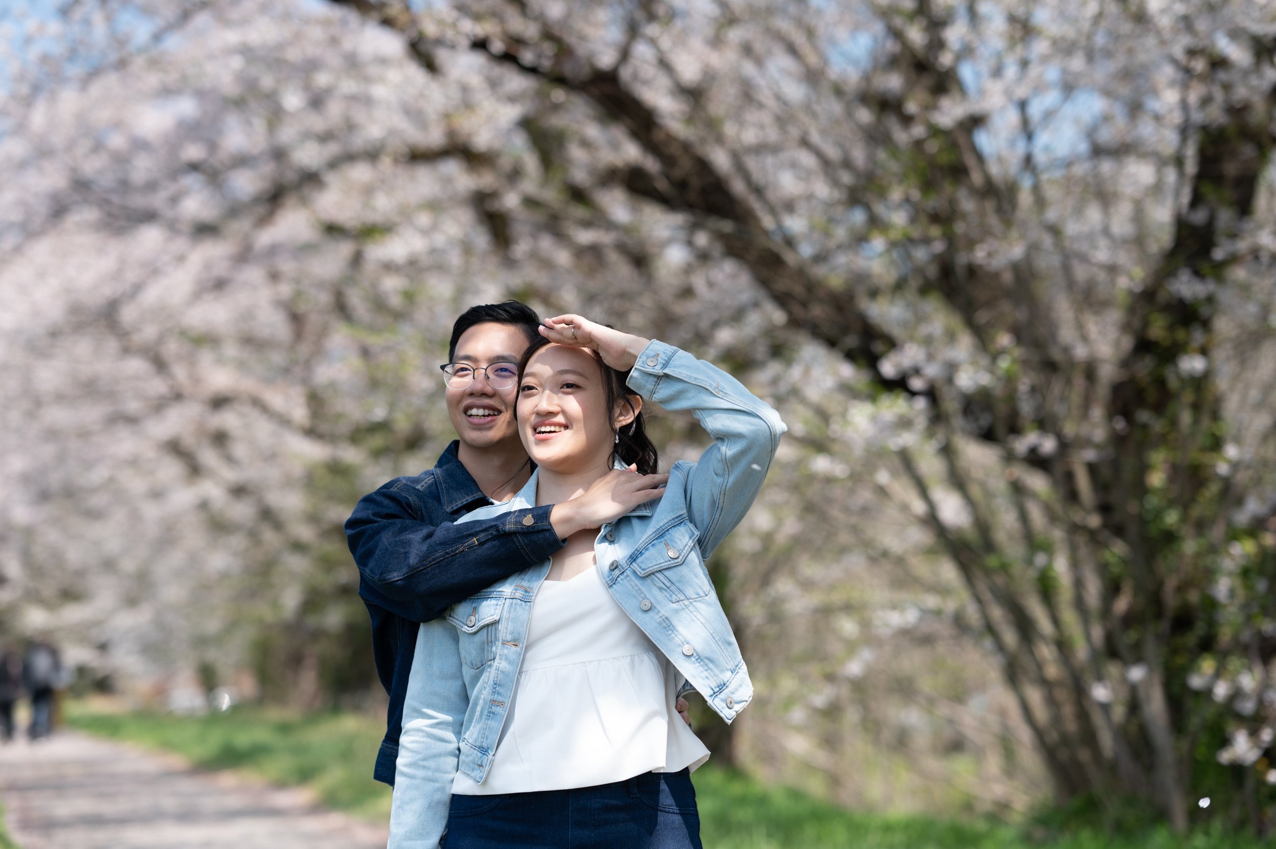 The shoot begins among cherry blossoms, where soft pink petals frame quiet moments between the couple. Walking hand in hand, sharing smiles, and laughing naturally under the trees reflects their excitement and tenderness of starting a life together.