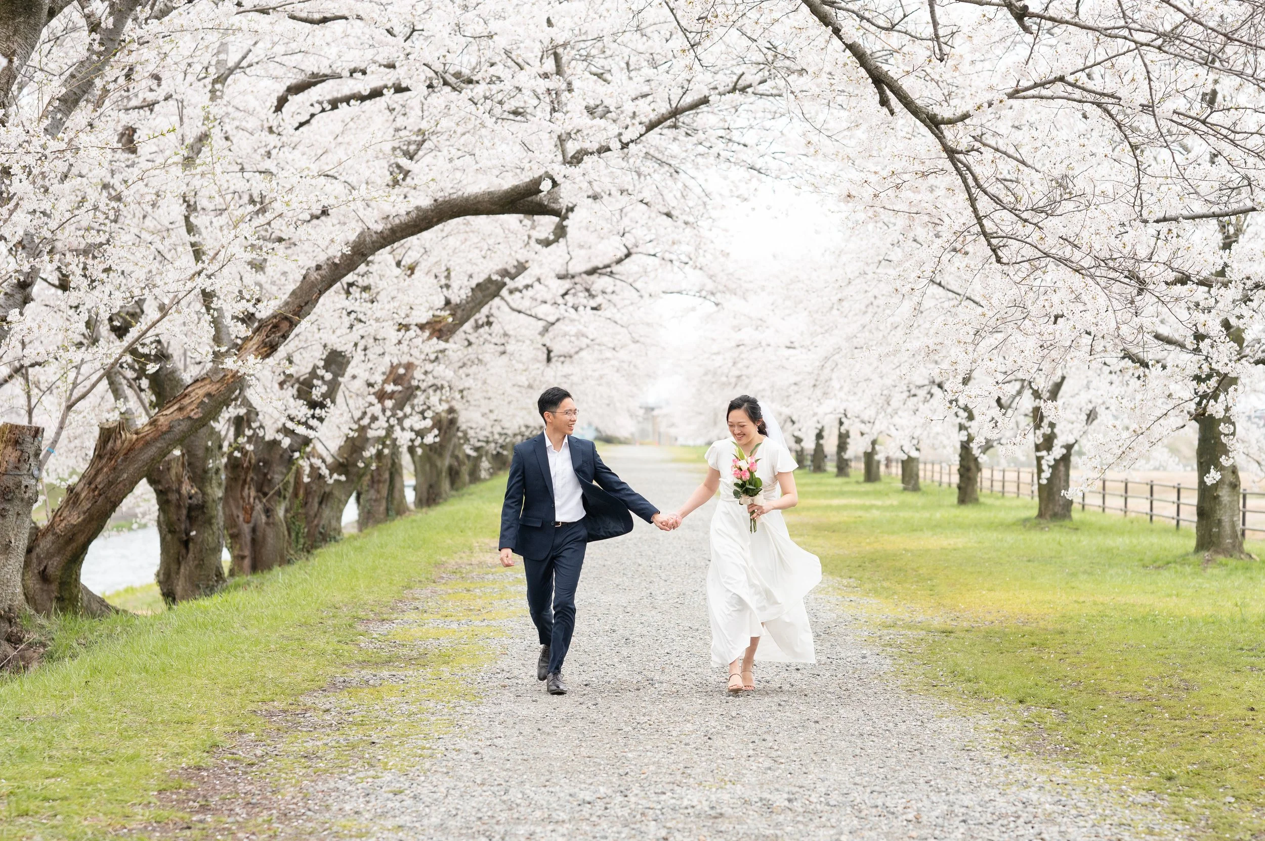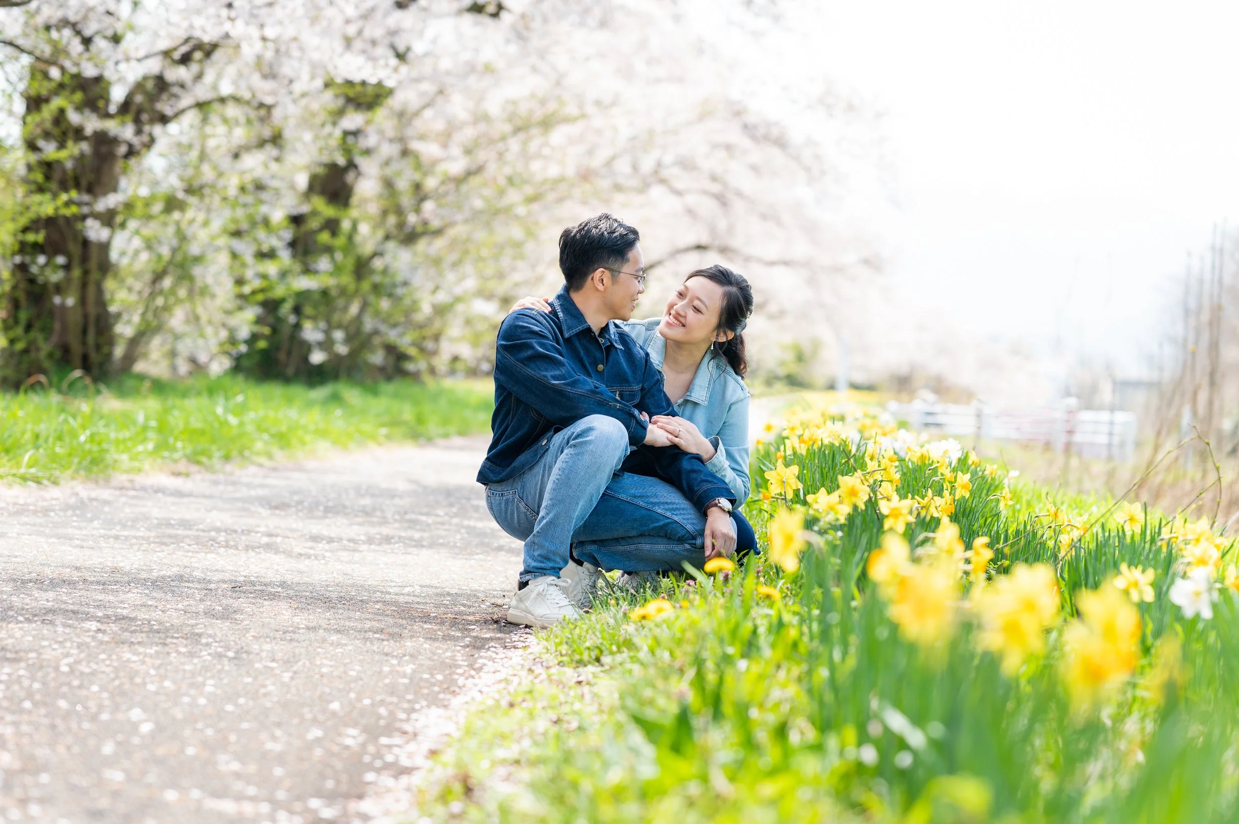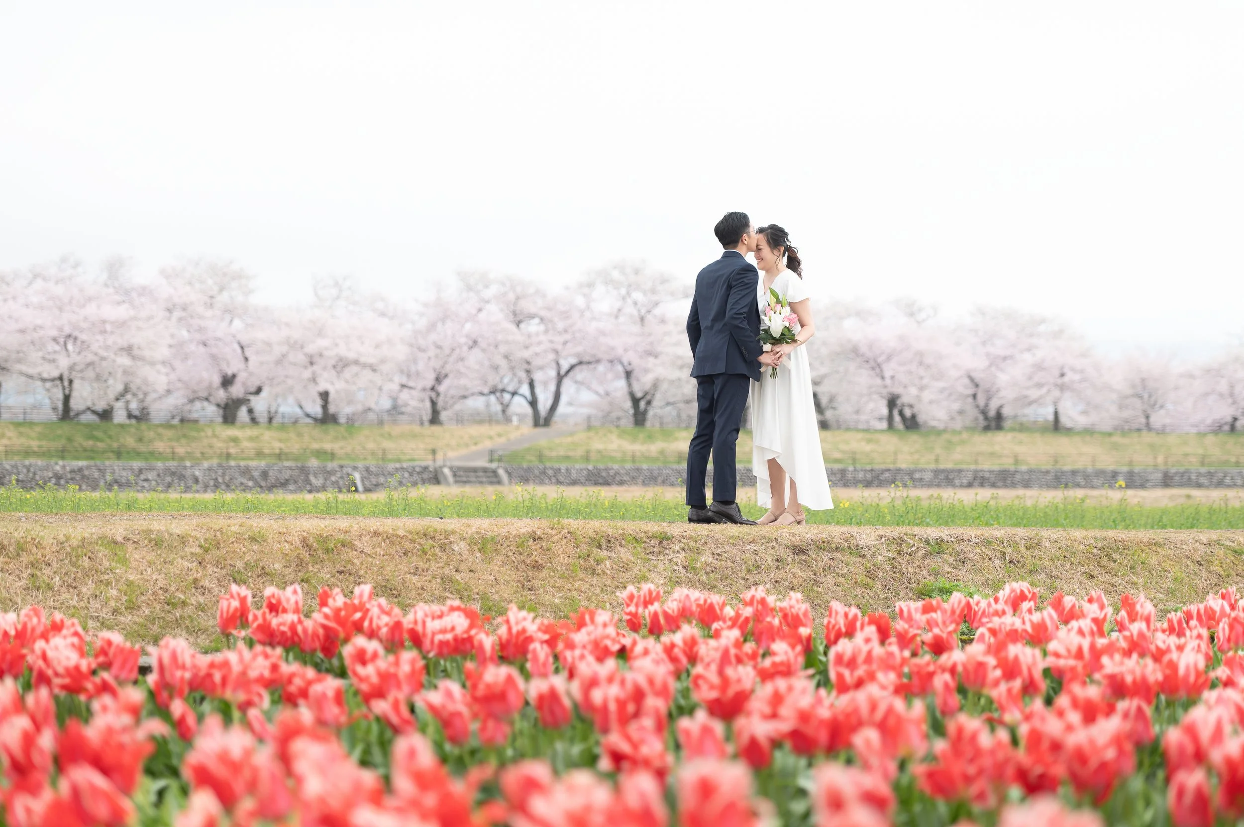 Toyama Prefecture is an ideal location for a pre-wedding photo shoot that feels natural, relaxed, and meaningful. The scenery came together beautifully—cherry blossoms in full bloom, colorful tulip fields, distant mountains, —creating a perfect setting to capture a couple truly in love.
